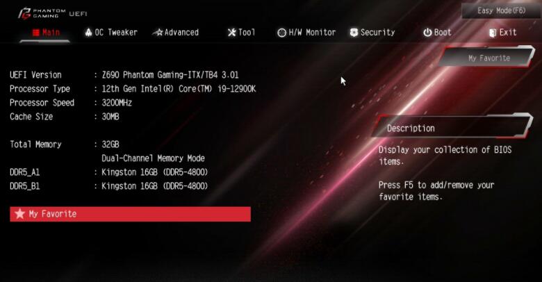 接下来看到ASRock Z690 Phantom Gaming-ITX/TB4的BIOS界面,主题是Phantom Gaming经典红银黑配色。提供可以快速开启X.M.P、RAID跟灯效开关的简易模式,与能详细设定的进阶模式等。后者提供超频工具、进阶菜单、工具、硬件监控、安全界面跟开机菜单等。