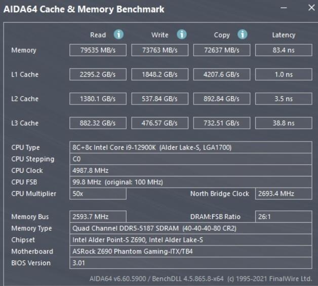 AIDA64內存与缓存测试,內存使用Kingston FURY Beast DDR5 16GBx2,搭配ASROCK Z690 PHANTOM GAMING-ITX/TB4有着內存读取79535 MB/s、写入73763 MB/s、复制72637 MB/s、延迟83.4 ns的表现。