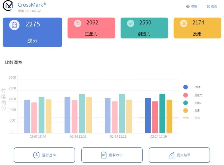 CrossMark进行测试。测试内容从并分成生产力、创作力与反应力三大类别,加上总分总计有4个分数,让玩家从不同面向的实际应用,来知道电脑的实际性能表现。并支持跨平台功能,除了Windows之外,还有macOS、iOS、Android等。