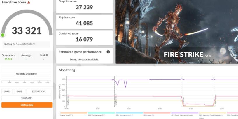 3DMark Fire Strike是基于DirectX 11的游戏测试,将电脑在运行AAA游戏时的表现以分数化来评断。而在1080P分辨率下运行的Fire Strike,获得总分33321分、而i9-12900K的物理分数与RTX 3070 Ti显卡分数则分别获得41085分跟37239分。