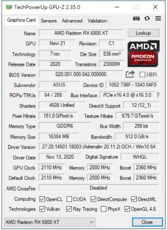 GPU-Z截图,可以看到RX 6800 XT的详细信息。采用Navi 21核心芯片、制程为7 nm,Shaders核心数量为4608个,显示內存则为GDDR6 256-Bit 16384 MB。在时脉方面,预设核心时脉为2110 MHz、Boost时脉可达2360 MHz、內存时脉为2000 MHz。