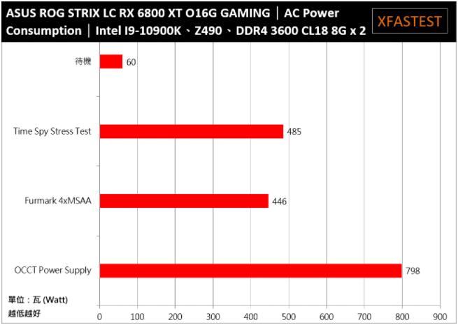 在功耗方面,单纯对显卡进行负载最高为485W,整机功耗为798W。如果用户有搭配高阶的CPU,例如本次的I9-10900K并有解锁PL了话,情况允许还是建议各位搭配至少850W以上、大厂可靠的电源供应器。