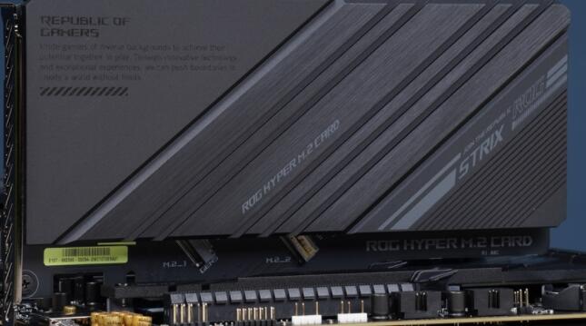 这次在ROG STRIX Z690-E的配件中也有给到ROG Hyper M.2扩充卡,外观上可以看到有超大的散热片,内部给到2个M.2插槽,不过频宽部分以及可以使用的插槽数量,会依据安装在不同PCIe插槽上而有变化,其中只有在安装在主板最下方PCIe 4.0插槽上,可以让两个M.2插槽都能使用,并运行在PCIe 4.0 x4的频宽,且这个PCIe 4.0插槽设计在最下面,如果玩家安装一般尺寸机壳也不能安装显卡,笔者觉得基本上应该就是为ROG Hyper M.2扩充卡而设计的。