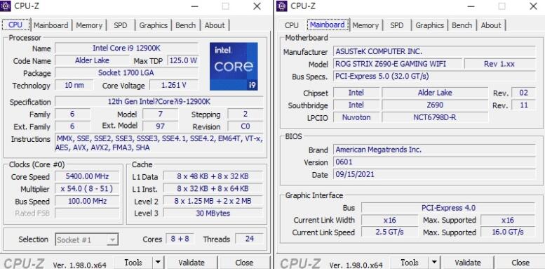 首先透过CPU-Z可以看到这次测试采用的处理器为8C+8c 24T的Intel Core i9-12900K,运行时脉单核最高会落在5.4GHz。主板ROG STRIX Z690-E的晶片组代号为Alder Lake的Z690,测试搭配的內存时脉为5200 MHz四信道共32GB,另外在CPU-Z Bench测试中,CPU单线程获得880分、多线程则为11840分。