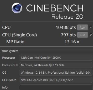 Cinebench主要测试CPU的图象渲染,Cinebench R20有着复杂的场景,并加入了光线追踪运算,测是结果intel Core I9-12900K单核心运算为797 pts、多核心运算为10488 pts。新版的Cinebench R23测是结果,Intel Core i9-11900K单核心运算为2081 pts、多核心运算为27524 pts。