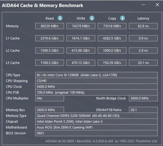 透过AIDA64缓存与內存测试,采用2条DDR5內存@ 5200 MHz,內存读取速度为80220 MB/s、写入速度为74278 MB/s、复制速度则是73516 MB/s,而延迟为82.8 ns。