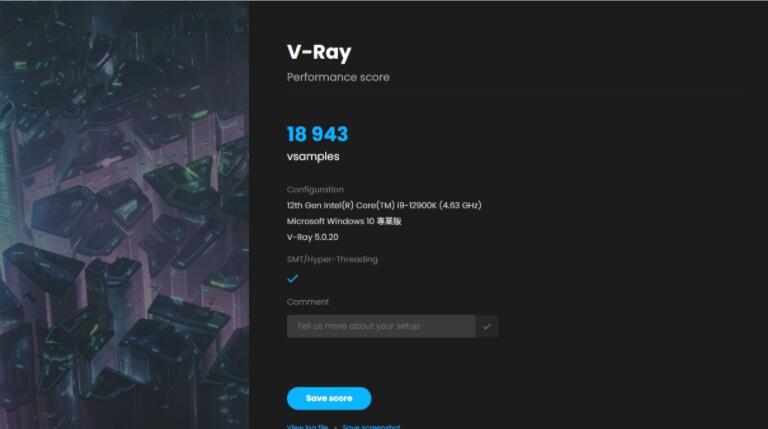 V-Ray Benchmark透过光线追踪渲染图象的运算,可以分别对CPU与GPU做运算速度的测试,这个测试结果是以秒为单位的运算时间,时间越短代表运算速度越快,测试结果为获得16899分。新版的V-Ray 5 Benchmark提供3种新场景,其中显卡测试能针对NVIDIA CUDA及RTX分开做性能测试,不过这次仅测试处理器部分,在测试中获得18,943分。