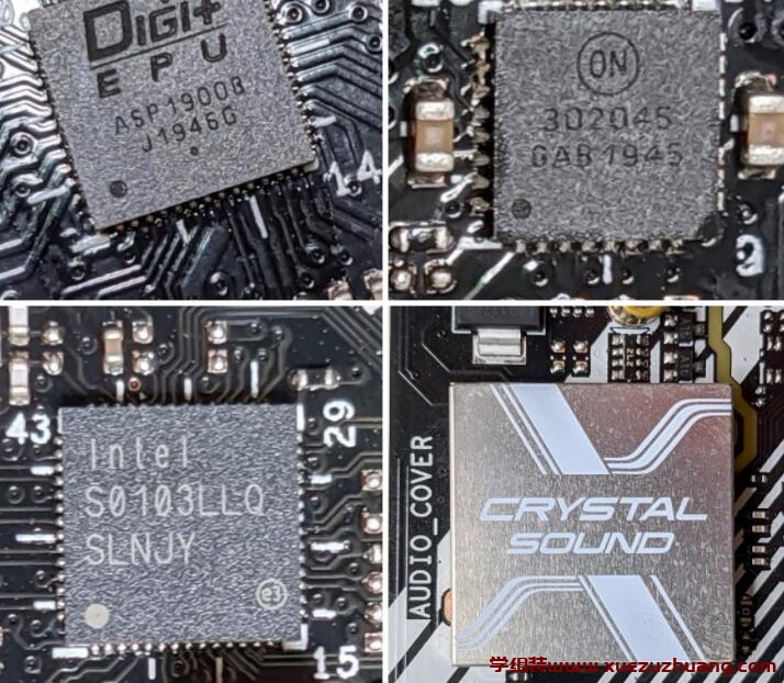 左上DIGI+ ASP 1900B PWM,右上NCP302045 45A MOSFET,左下Intel I225-V 2.5Gb,右下Realtek S1220A音效芯片。