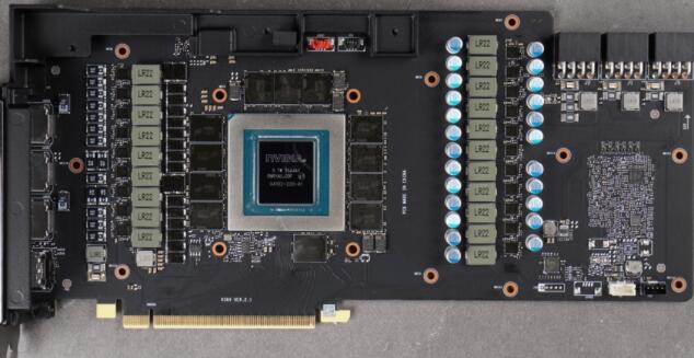 PCB中央可以看到为代号GA102-220-A1的RTX 3080 12GB版本核心芯片,供电部分可以看到是20相Dr.MOS供电设计,单相能提供50A的电流输出,基本与RTX 3080 Ti版本一致,內存为12颗代号D8BWW的1GB美光內存颗粒,并透过3个8-Pin接头供电。