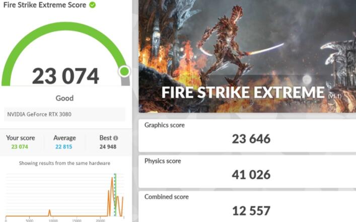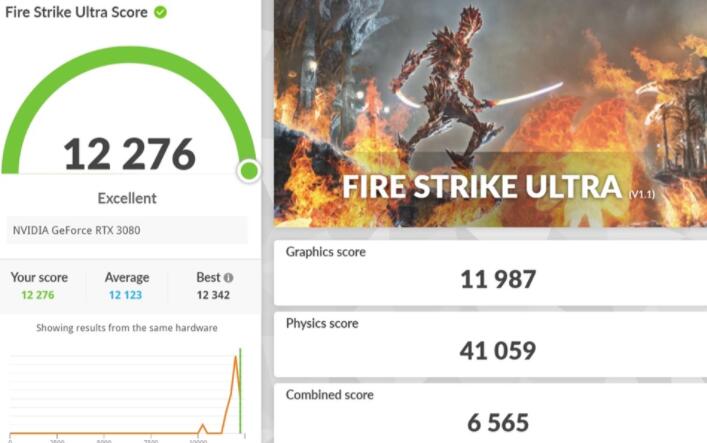 3DMark为模拟3A级游戏绘图运算的性能测试软件,其中Fire Strike系列是模拟DX11游戏运行的情况,在FHD分辨率的Fire Strike测试中,RTX 3080 SUPRIM X 12G LHR的分数获得了40,075分;2K分辨率的Fire Strike Extreme测试中,获得了23,074分;4K分辨率的Fire Strike Ultra测试中,获得了12,276分。