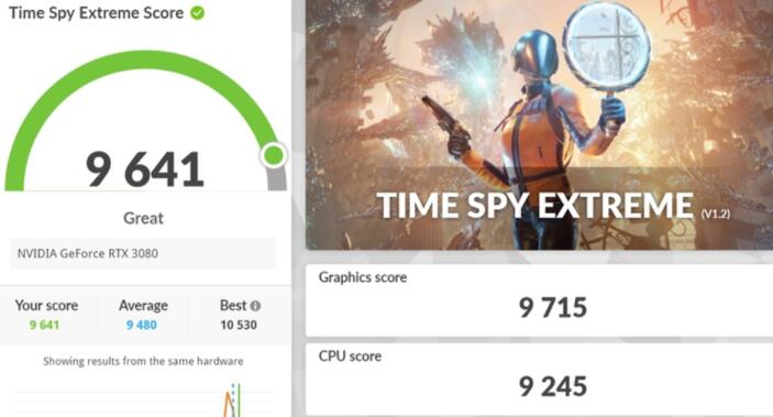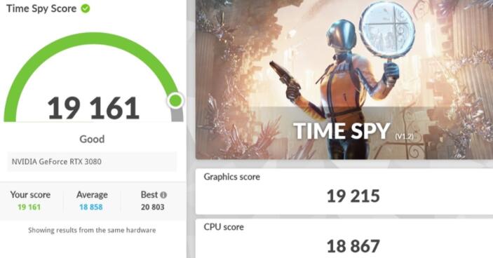 DX12 API测试一样使用3DMark进行,Time Spy系列则主要是测试DX12下的游戏表现,预设分辨率为2K,RTX 3080 SUPRIM X 12G LHR获得19,161分,而4K画质的Extreme测试,获得9,641分。
