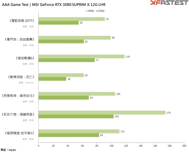 首先AAA游戏测试在1440p特效全开下,基本都能有平均60帧以上的表现,其中只有《战栗深邃:流亡》平均帧率低了些,而《极地战嚎6》、《刺客教条:维京纪元》、《虹彩六号:撤离禁区》及《极限竞速:地平线5》比较不吃性能,均可达破百帧的成绩,2160p下《电驭叛客2077》这次使用官方新推出的跑分模式,帧率相比以往测试低了点,但平均帧率也还有55 FPS,而《战栗深邃:流亡》仅能守住30帧低标,整体看下来RTX 3080 12GB基本作为4K AAA大作入门卡也还算可以。