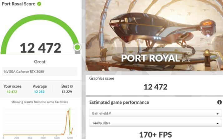 光追部分,Port Royal为加入光线追踪技术的游戏模拟测试,预设测试分辨率为1440p,RTX 3080 SUPRIM X 12G LHR通过测试并获得12,472分,另外在NVIDIA DLSS feature test项目中,可以看到在2K分辨率下开起光追,同样测试场景下,开启性能模式后,能将帧数从原本的57.89提升至127.11,估计在不开启DLSS功能的情况下,RTX 3080 12 GB本身就差不多能满足1440p光追游戏的需求,开启DLSS功能之后就可以更流畅的运行光追游戏。