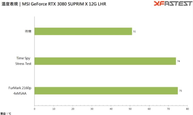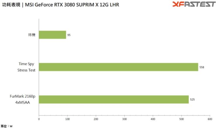 温度与功耗测试以整平台最高数值为主,搭配的是i9-12900k处理器,透过FurMark、Time Spy Stress Test、GPU-Z,模拟高负载、DX12游戏及待机等情况下的温度及功耗。RTX 3080 SUPRIM X 12G LHR待机时温度为51度,整平台功耗95 W;Time Spy Stress Test运行时的温度则为74度,整平台功耗558 W;FurMark 4xMSAA运行时的温度则为75度,整平台功耗525 W,在测试下有发现在游戏运行时,瞬间锋值可以抽到600 W,建议玩家在电源供应器的配置上可以依照官方建议,搭配至少750W以上会比较保险。