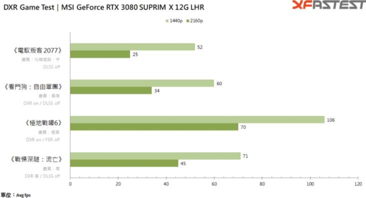 光追测试部分以《电驭叛客2077》、《看门狗:自由军团》、《极地战嚎6》、《战栗深邃:流亡》4款游戏进行测试,1440p分辨率特效全开明显对RTX 3080 12 GB来说就开始有些吃力,仅《极地战嚎6》比较不吃性能,平均帧数还算可以,其余3款游戏在1440p平均帧率就仅有60 FPS上下,而2160p就只有平均30 FPS左右。