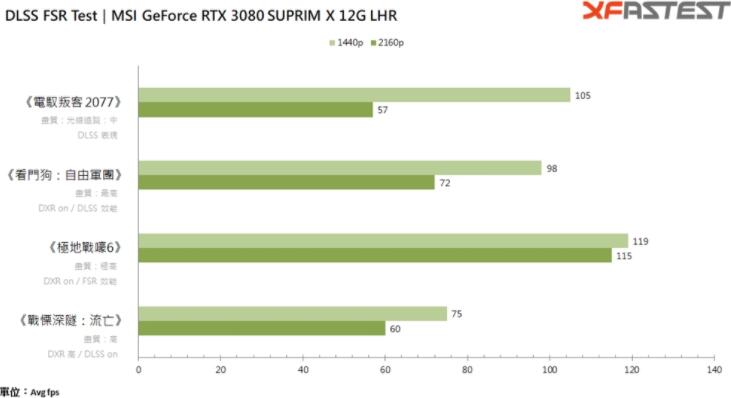 而如果你觉得在光追开启后的帧率不是很满意,其实还可以透过开启DLSS或FSR功能,来获得更高的帧数,在实测下《电驭叛客2077》及《看门狗:自由军团》可以获得约30~50帧的平均帧数提升,《极地战嚎6》在测试下发现虽然1440p开启FSR对帧率提升不明显,但2160p下可以提升至平均破百帧,另外《战栗深邃:流亡》则是在两个分辨率下,平均帧率分别提升至60及75。