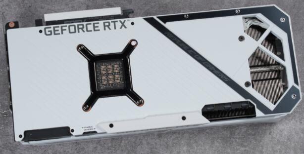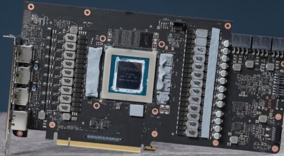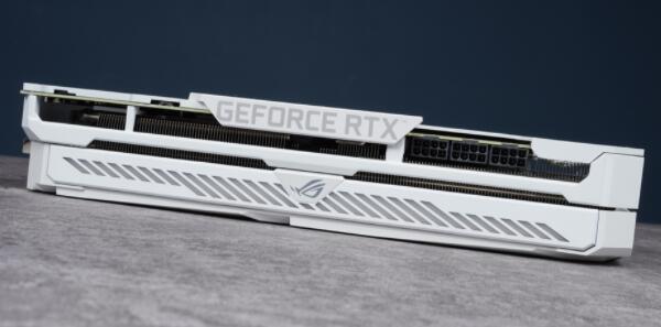显卡侧边部分,可以看到依旧有ARGB的灯效设计,不过整条发光条可以看到从亮面的设计改为雾面表面,除了让其更好的融入外观,也比较不容易沾指纹。后端的部分因为这次RTX 30系列较厚,特别在这个空白处做了ROG的字样浮雕,可以发现近期华硕在更多产品的细节设计上着墨。而在另一侧输出接口的部分,提供了2组HDMI 2.1及3组DisplayPort 1.4a,不过虽然有5个输出接口,但只支持同时4个画面输出。