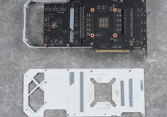 在PCB前后有中框及金属背板固定在一起,强化整个显卡结构,金属背板卸下后,可以看到在供电区域有粘贴导热贴片,让金属背板也能发挥散热功效。而在PCB背面部分可以看到在处里滤波及稳压的电容用料上,选择的是6组MLCC。