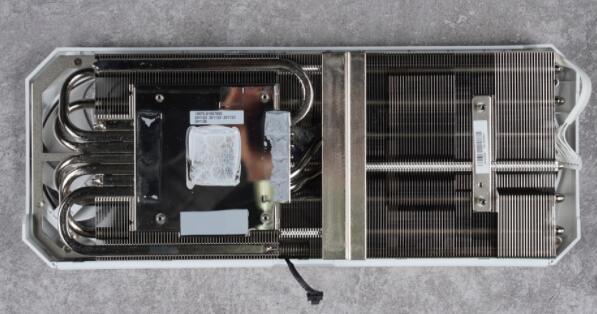 散热器部分尺寸可以说是相当大,庞大的铝鳍片由7个热导管贯穿,其中包含6根U型热导管及1根S型热导管。中间部分可以看到依然使用MaxContact精密抛光技术制成的镀镍铜均热板,针对核心及內存部分做快速的导热,另外靠近中间的部分有一片金属板,透过导热胶帮助供电元件散热。