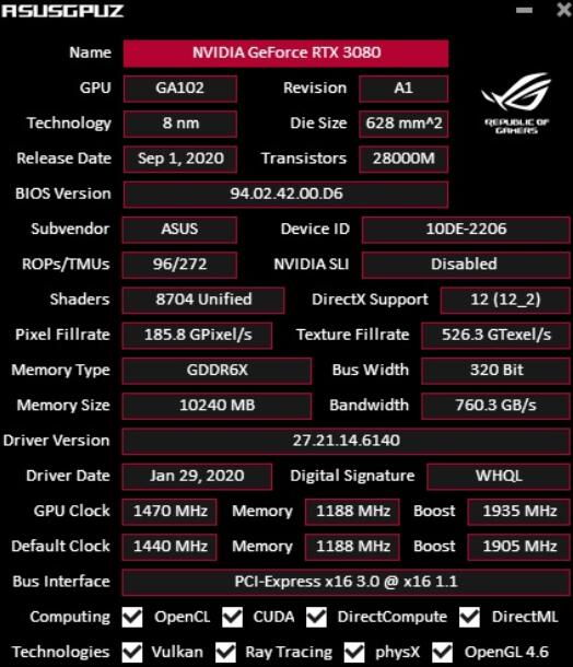 首先看到GPU-Z信息,RTX 3080核心采用GA102核心芯片、制程为8 nm,有着8704个Cuda核心,內存则为Micron GDDR6X 320-bit 10240 MB,在时脉方面核心时脉为1440 MHz、Boost时脉为1905 MHz、內存时脉为1188 MHz,透过GPU TWEAK III开启超频模式后,核心时脉提升至1470 MHz、Boost时脉则提升至1935 MHz。