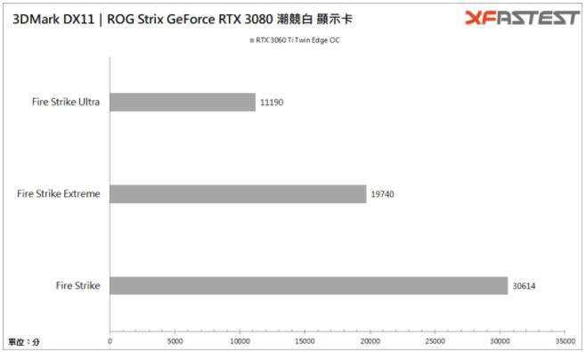 3DMark为模拟3A级游戏绘图运算的性能测试软件,其中Fire Strike系列是模拟DX11游戏运行的情况,在FHD分辨率的Fire Strike测试中,RTX 3080潮竞白的分数获得了30,614分;1440p分辨率的Fire Strike Extreme测试中的分数获得了19,740分;2160p分辨率的Fire Strike Ultra测试中的分数获得了11,190分。
