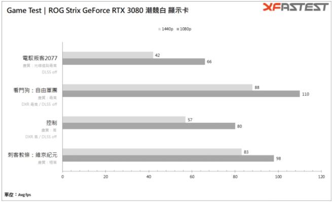 在游戏测试部分,采用数款不同性质的游戏进行测试,并都以1080p分辨率进行测试,主要针对具备光追的3A大作进行测试,包含2020推出的大作《电驭叛客2077》、《看门狗:自由军团》,另外还有经典光追大作《控制》,而无光追的3A游戏就找来了《刺客教条:维京纪元》做测试,由于这次测试仅有针对主流1080p及1440p,因此所有游戏设定都调至预设特效最高的一阶,DLSS则全部关闭。