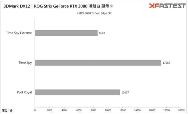 DX12 API测试一样使用3DMark进行,Port Royal为加入光线追踪技术的游戏模拟测试,预设测试分辨率为1440p,RTX 3080潮竞白通过测试并获得11,627分;Time Spy系列则主要是测试DX12下的游戏表现,Time Spy预设分辨率为1440p,测试下获得17,265分,而2160p画质的Extreme测试下获得8,569分。