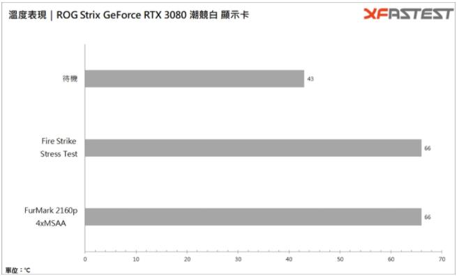 ROG Strix GeForce RTX 3080潮竞白待机时由于有风扇低温停转设定,温度约为43度上下,而不论是Fire Strike Stress Test或FurMark运行时的,温度最高都落在66度,整体表现还算不差。整机功耗部分测得最高落在460 W上下,不过测试中处理气不是满载运行,建议玩家可以挑大一点的瓦数来搭配会比较保险。