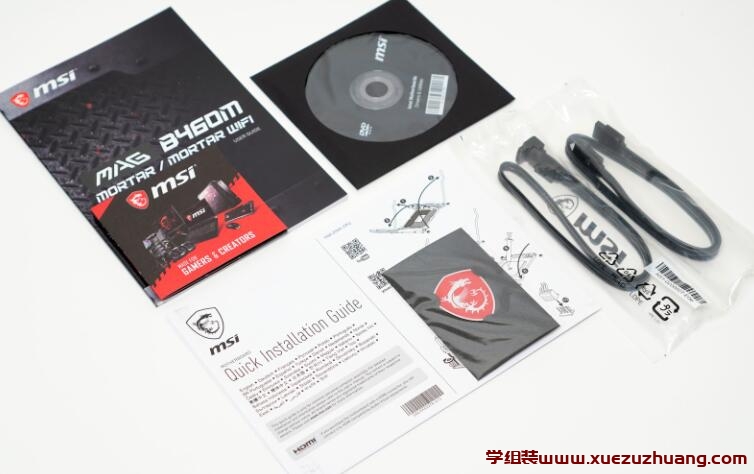 说明书、驱动光盘、快速手册、MSI龙纹贴、SATA线材。