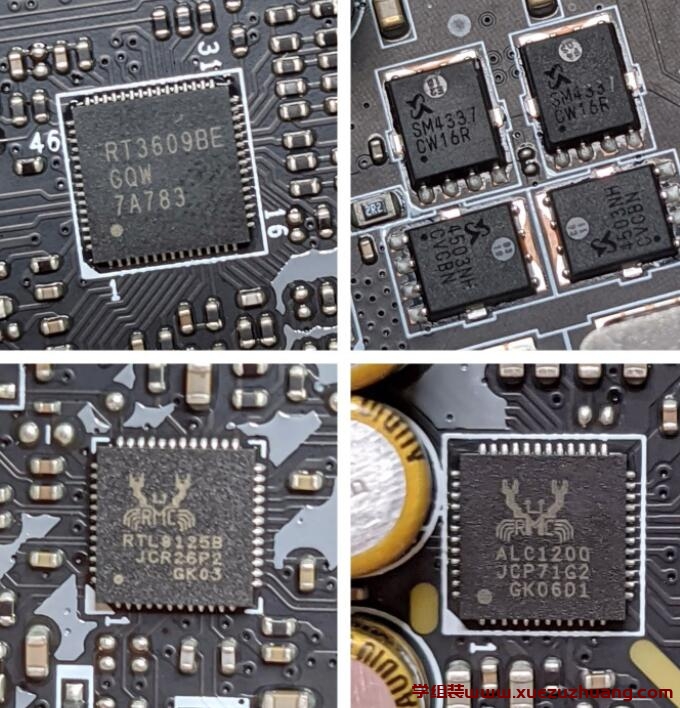 PWM供电控制器是Richtek RT3609BE,最大可以控制6 +2相,MOSFET一上是SINOPOWER SM4337NSKP 55A,一下是用SINOPOWER SM4503NHKP 80A,Realtek RTL8125B 2.5G LAN控制器,Realtek ALC1200译码芯片。