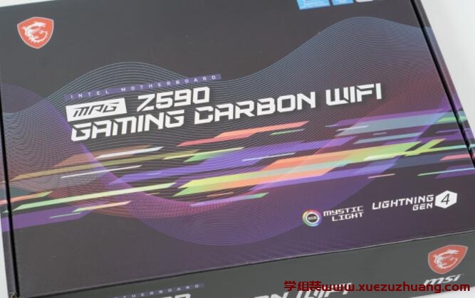 MPG Z590 GAMING CARBON WIFI这次的包装有一些向量等化器图,看起来更有未来感,正面强调有Lightning Gen 4,但是还是需要搭配新处理器,还有MYSTIC LIGHT能增添RGB控制乐趣,包装背面强调用料很高级,散热器马甲不只是散热好,还有兼顾好看美观。