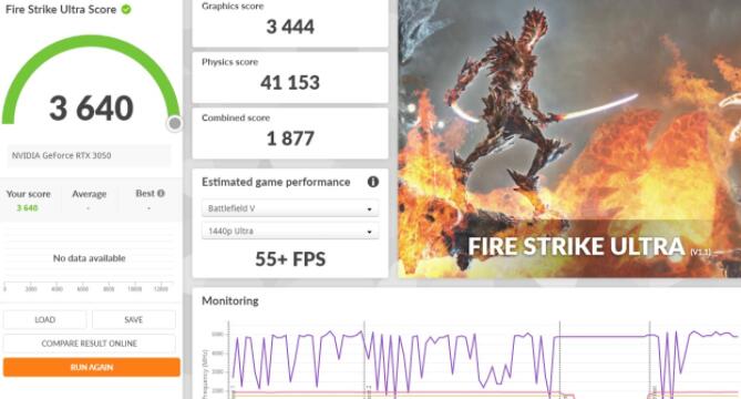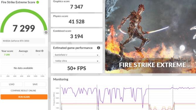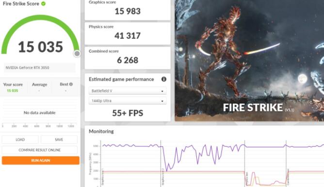 3DMark为模拟3A级游戏绘图运算的性能测试软件,其中Fire Strike系列是模拟DX11游戏运行的情况,在FHD分辨率的Fire Strike测试中,RTX 3050 Twin Edge OC的分数获得了15,035分;2K分辨率的Fire Strike Extreme测试中,获得了7,299分;4K分辨率的Fire Strike Ultra测试中,获得了3,640分。