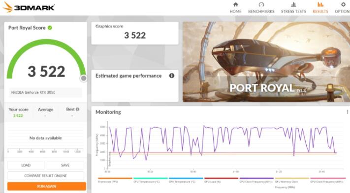另外光追部分,Port Royal为加入光线追踪技术的游戏模拟测试,预设测试分辨率为2K,RTX 3050 Twin Edge OC通过测试并获得3,522分,另外在NVIDIA DLSS feature test项目中,可以看到在2K分辨率下开起光追,同样测试场景下,开启性能模式后,能将帧数从原本的16.3提升至41.52,如果玩家想用RTX 3050以2K分辨率玩光追游戏,可能还是有点勉强,但1080p应该问题就不大。