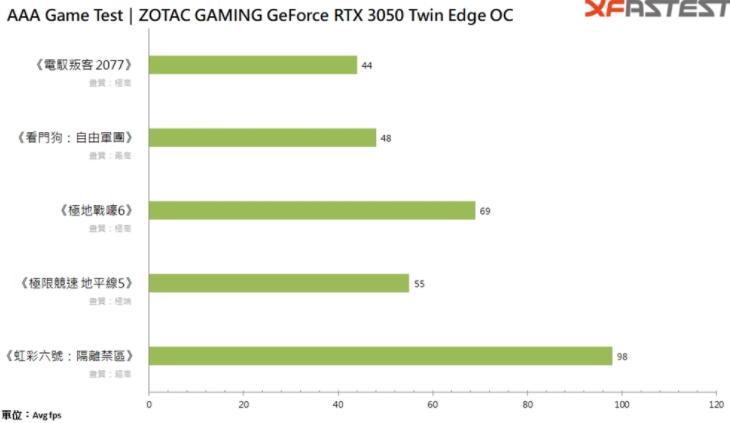在游戏测试部分,选择《电驭叛客2077》、《极地战嚎6》、《看门狗:自由军团》、《虹彩六号:撤离禁区》及《极限竞速:地平线5》,其中可以看到在1080p特效全开下,《电驭叛客2077》、《看门狗:自由军团》及《极限竞速:地平线5》约只能有平均40~50 FPS左右的表现,特效开开低一阶画面会顺畅些,而《极地战嚎6》在测试下可以稳近70 FPS,刚上市的《虹彩六号:撤离禁区》则是能有近100 FPS的流畅表现。