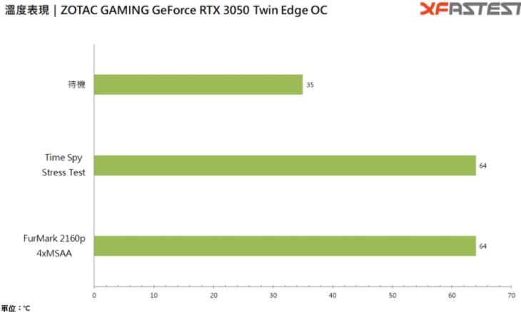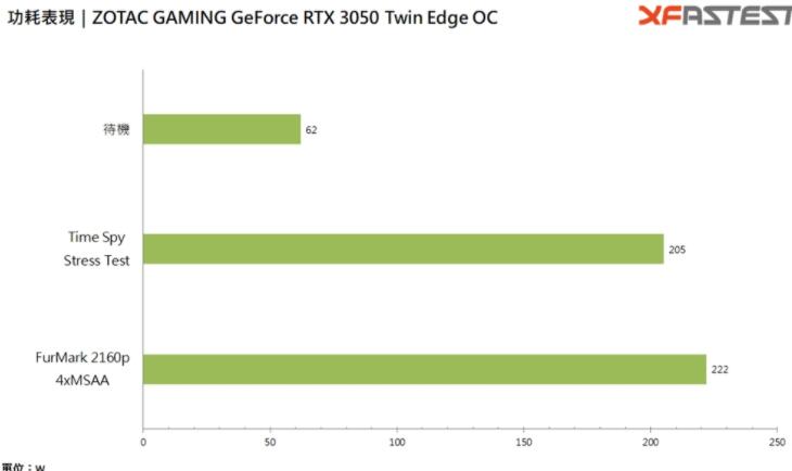 温度与功耗测试以整平台最高数值为主,搭配的是i9-12900k处理器,透过FurMark、Time Spy Stress Test、GPU-Z,模拟高负载、DX12游戏及待机等情况下的温度及功耗。RTX 3050 Twin Edge OC待机时温度为35度,整平台功耗62 W;Fire Strike Stress Test运行时的温度则为64度,整平台功耗205 W;FurMark 4xMSAA运行时的温度则为64度,整平台功耗222 W。功耗表现还算正常,温度部分不到70度的表现算是令人惊艳,或许RTX 3050玩家就不用执着于购买3风扇的大卡了。