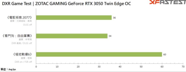 回到另外三款游戏,光追开启后可以看到仅有《极地战嚎6》还能勉强守住60 FPS大关,《电驭叛客2077》平均36 FPS,《看门狗:自由军团》仅则是因为內存容量够,降至非常高的设定进行测试,最终获得平均34 FPS的成绩。