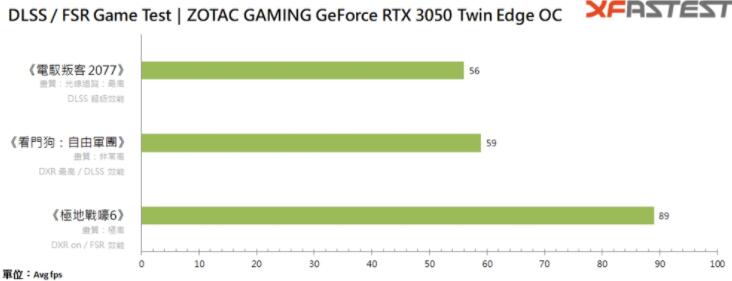 虽然30 FPS以上的表现,在开启垂直同步之后,一就可以以30帧的帧数游玩,但其实玩家也是可以透过开启DLSS或FSR功能来获得更高的FPS,这三款游戏中《电驭叛客2077》及《看门狗:自由军团》支持DLSS、《极地战嚎6》支持FSR,在开启性能模式后均能感受到显著的帧率提升,不过也能发现《电驭叛客2077》及《看门狗:自由军团》仅是接近60 FPS的表现而已,建议玩家还是可以适度调整特效来获得流畅的游戏体验。