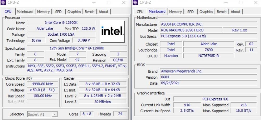CPU-Z检视Intel Core i9-12900K与i5-12600K处理器信息,代号Alder Lake的Intel 7制程处理器;i9-12900K为8+8核心24线程、i5-12600K则是6+4核心16线程,搭配ROG MAXIMUS Z690 HERO主板,BIOS 0604版本,內存则是双通道64GB 5200MHz。