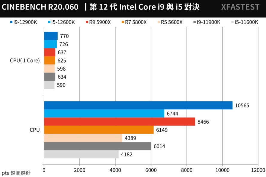 过往是Intel不想面对的测试项目,现在i9-12900K CPU成绩达10565分的超高成绩、i5-12600K也有着6744分的成绩,性能上i9-12900K比起5900X快了24%、比i9-11900K快75%的性能,而i5-12600K则比5600X快53%、比i5-11600K快61%的惊人成长。