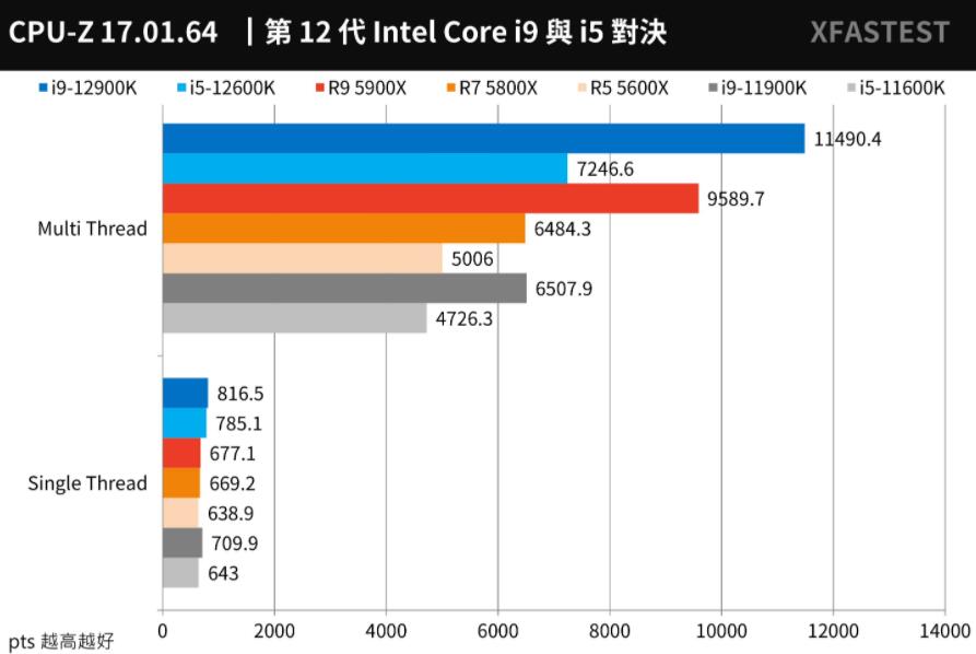 单线程性能上i9-12900K达到816.5分、i5-12600K则有785.1分的成绩,也是该项目中的第一、第二名,无疑是目前单线程、多线程的性能王。