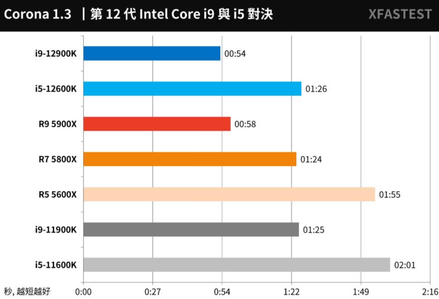 i9-12900K以54秒的速度夺冠、i5-12600K也有着1:26(分:秒)的成绩;这项目i9-12900K比起5900X快了4秒,而i5-12600K则与5800X、i9-11900K成绩相近。