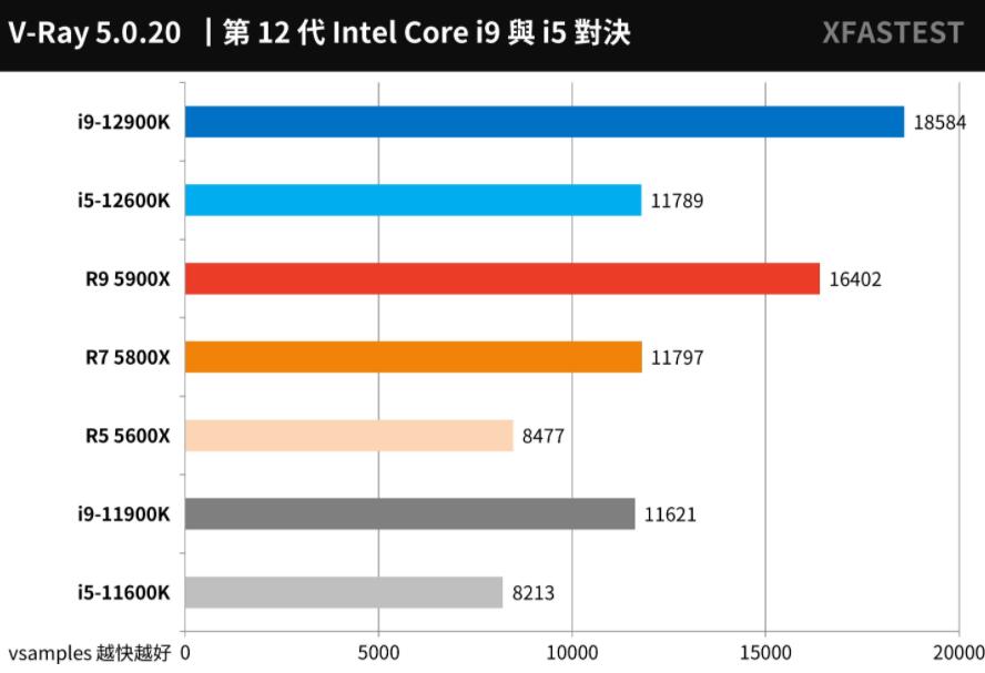 i9-12900K以18,584的运算性能夺冠、i5-12600K也有着11789的运算性能;i9-12900K在多核性能上轻松营过5900X,而i5-12600K则有着5800X、i9-11900K相当的性能。