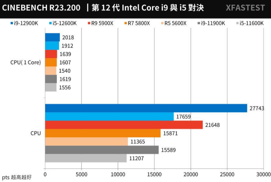 i9-12900K CPU获得27743分的成绩,i5-12600K则获得17659分;单核方面i9-12900K获得2018分、i5-12600K也有着1912分成绩,同样技压所有比较的处理器。