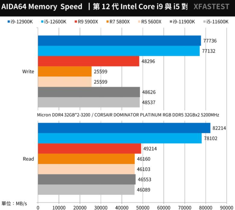 i9-12900K与i5-12600K使用CORSAIR DOMINATOR PLATINUM RGB DDR5 32GBx2 5200MHz內存,可达到读取82214 MB/s、写入77736 MB/s的高效能;相对DDR4平台则使用Micron DDR4 32GBx2 3200MHz內存。