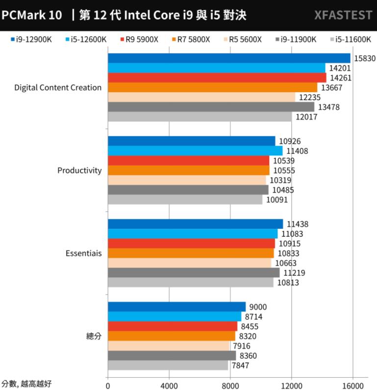 i9-12900K达到9000分的高成绩,更在图像内容创作上获得15830的亮眼成绩,而i5-12600K也有着8714分的总成绩,整体性能也优于比较的处理器;比较上,i9-12900K比5900X快了6%、比i9-11900K快7%,而i5-12600K则比5600X快10%、比i5-11600K快了11%。