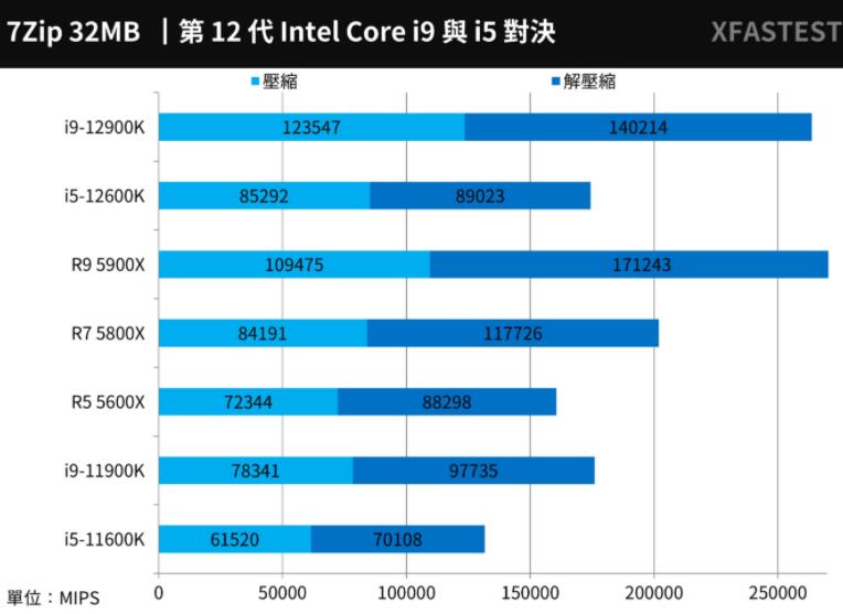 7-Zip压缩测试则可有效利用多核心的性能,但整体表现上反而是5900X有着小优势赢过i9-12900K,而5800X同样也赢过i5-12600K;或许有可能需要更新软件版本了。