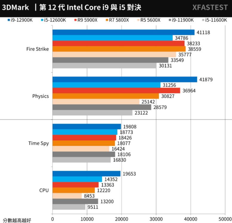 从跑分成绩来看i9-12900K在Fire Strike夺下41118分的总成绩,物理分数也高达41879分,而i5-12600K则是34786分;至于Time Spy测试上,i9-12900K达到19808分的成绩、i5-12600K则有着18773分的性能。