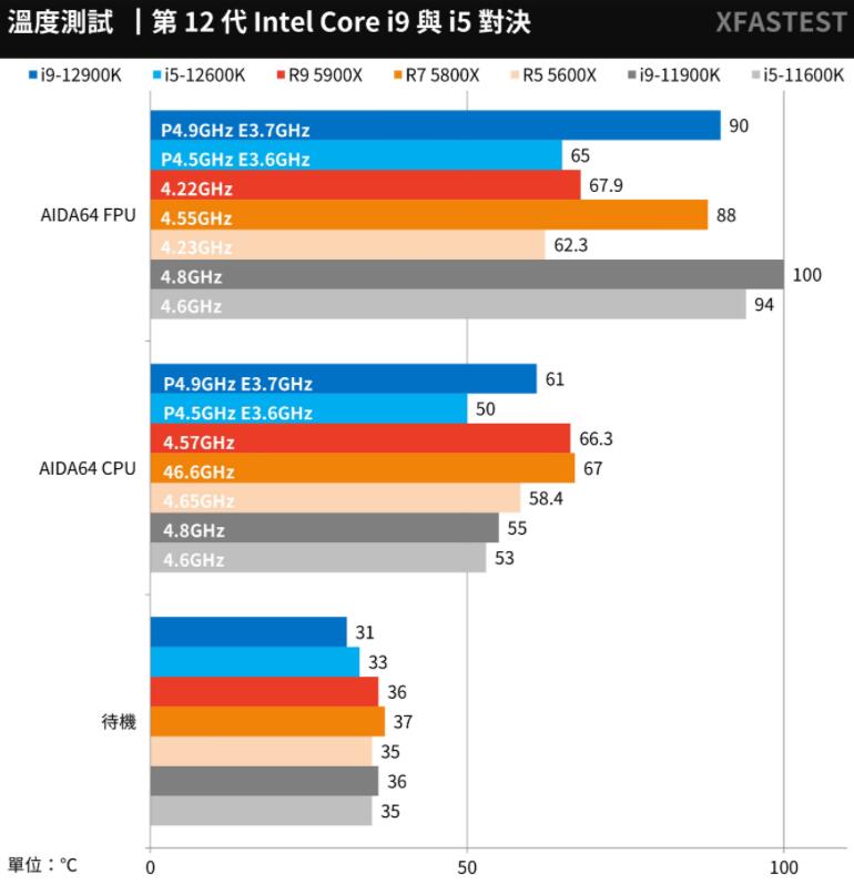 不过在AIDA64 FPU压力测试下,i9-12900K同时脉但温度来到90°C、i5-12600K则是65°C,整体温度一样是比上一代再低一些,不过还是比5900X与5800X的温度较高,但两者压力测适时的时脉相差也有断距离。