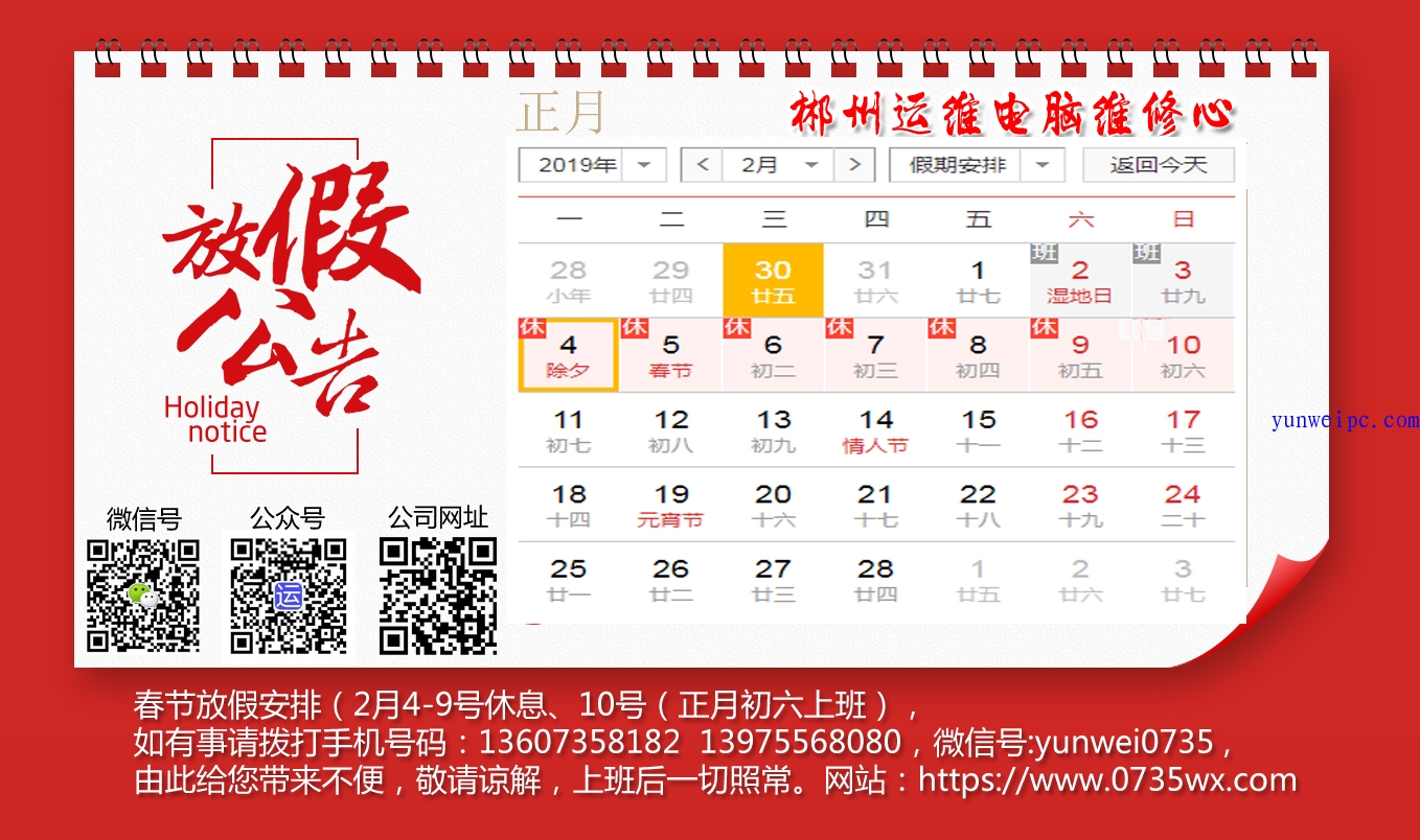 斗转星移,春华秋实,金猪将至,我们即将迎来2019年农历春节,在这辞旧迎新之际,非常感谢您对我们的支持与厚爱,我们深知运维电脑维修中心的发展壮大,离不开您的认可和支持、行业日益越的同时感谢您在工作上一直以来的理解和配合。