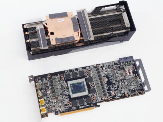 散热器部分,由6根纯铜散热管与大面积纯铜板直触GPU与內存进行散热。而其余如內存、供电模块等,也有粘贴导热胶与帮助散热。再搭配8公分的刀锋导流造型风扇,将热流从显卡排出。